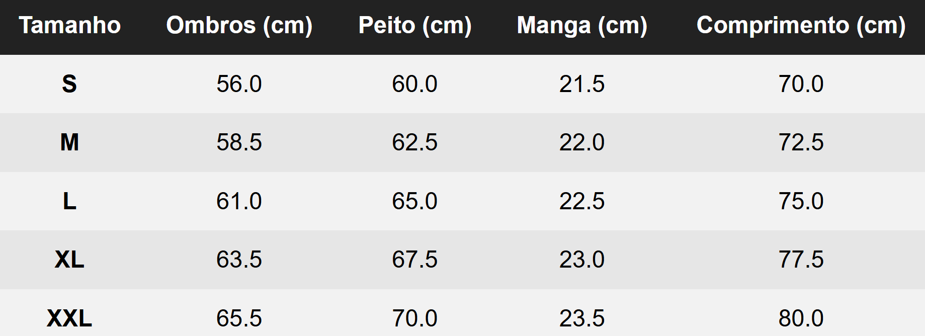1- Numeração em padrão internacional. Verificar as medidas da tabela e quando em dúvida optar por peças acima da sua numeração. Acesse a página Guia de Medidas e nosso blog para saber mais detalhes.